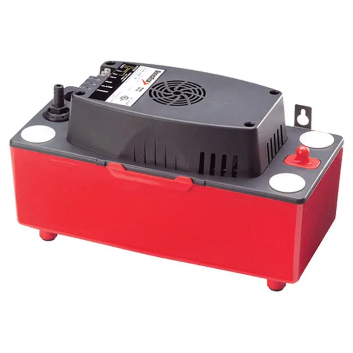 Suitable for use with condensate from air conditioning applications. 22 ft of lift compared to the typical 20 ft. Features include vibration dampening feet and motor mounts, metal hang tabs, four inlet holes, a clear indicator display, a float switch and check valve and pan pill dispenser. Integrating the CP-22 into your system is easy. 1/4 in quick connect terminals provide easy connection to the built in overflow switch. 3 terminals are provided allowing flexibility to connect air-handler shut-down and optional alarm as needed. The new CP-22LP comes packed with all the same great features found in the CP-22, but now in a low profile package. This pump is only 4-3/8 in. tall so it’s a good fit for those instances where space is at a premium. The shorter reservoir holds 1/3 gal. Suitable for use with condensate up to 160 deg F. Dimensions: 11.8 in L x 5.9 in W x 6.7 in H in,Electrical Ratings: 1.9 A 120 VAC 60 Hz,Flow Rate: 1.6 gpm
